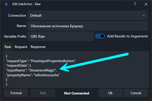 Минимальный экшен для обновления источника Browser в OBS